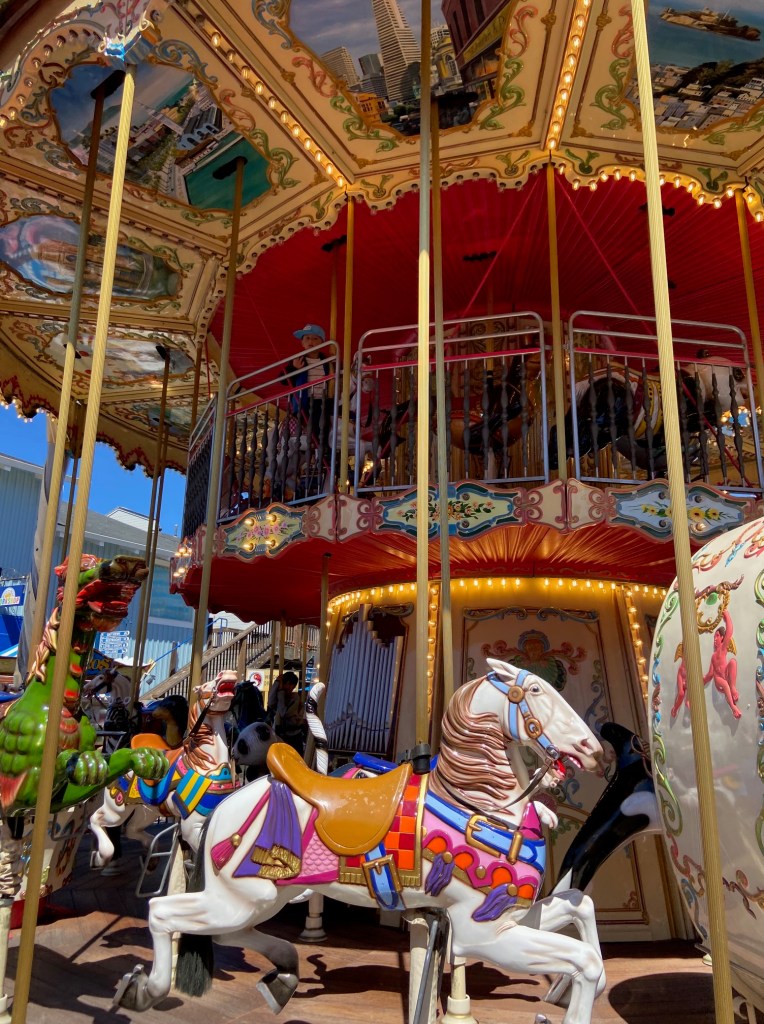 Before food, ChatGPT suggested a spin on Pier 39’s double-decker carousel. It was short, colorful, and guaranteed giggles. The ride was mostly empty, and my son loved sitting on the upper deck.