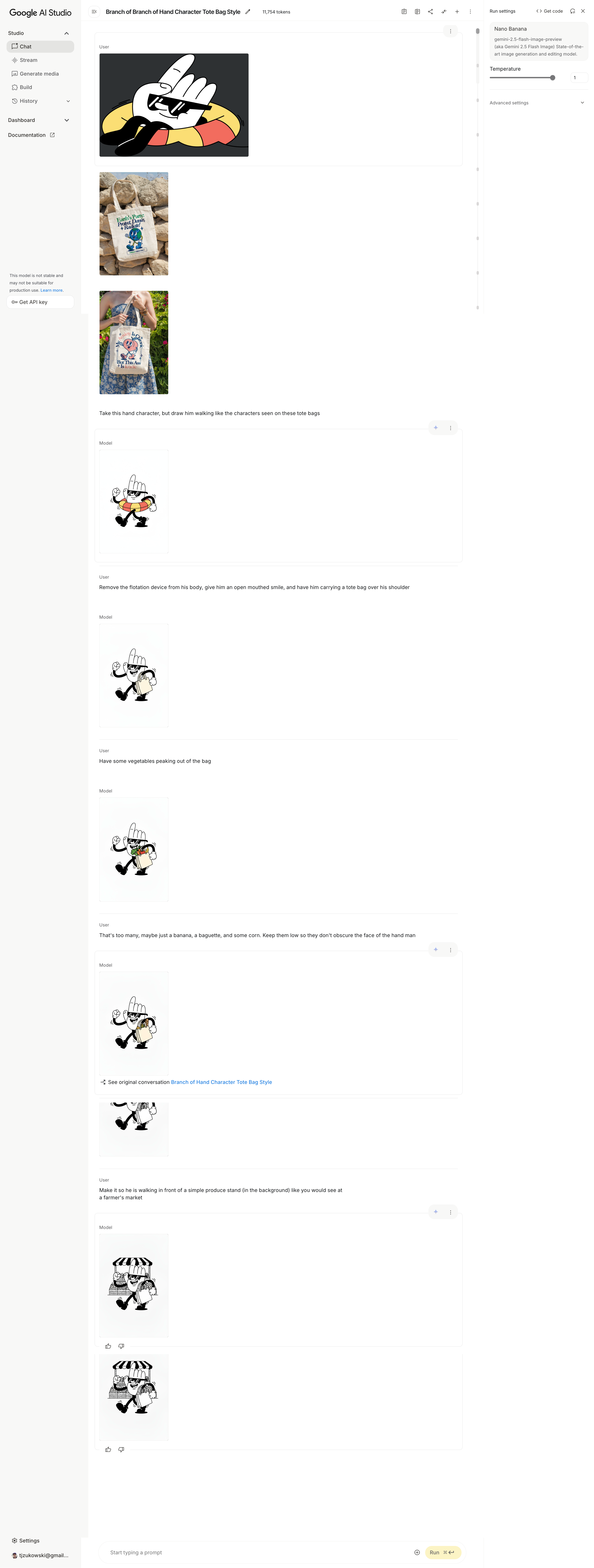 He wanted to create a set of tote bags featuring a quirky illustrated character for a work project. The character already existed, so the task wasn’t to invent something new. It was to reposition the image in the same style as the original reference.