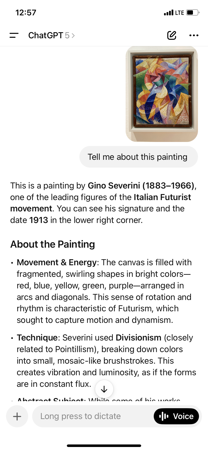 This time, I pointed my camera at a striking abstract painting filled with vibrant, intersecting shapes and colors. I took a photo and asked ChatGPT, “Tell me more about this painting.” It identified the artist as Gino Severini and broke down the symbolism, explaining how the interlocking forms could represent a dancer in motion, beams of light, or bursts of mechanical energy.
